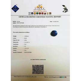 DATE:24-8-2023REF.NO:LN 930NAME:BLUE SAPPHIRE WEIGHT:10.25 CTSCOLOUR:BLUE TYPE OF/CUT:OVALDIMENSION:3.3-10.8-7.2CONCLUSION:N/AHARDNESS:9.0R.INDEX:1.76-1.78CLARITY:N/ASPECIFIC COMME..