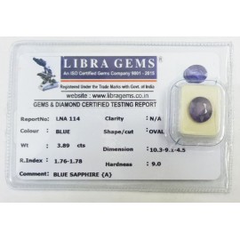 REPORT.NO.LNA 114CLARITY.N/ACOLOUR.BLUESHAPE/CUT.OVALWT.3.89 CTSDIMENSION.10.3-9.1-4.5R.INDEX.1.76-1.78HARDNESS.9.0COMMENT.BLUE SAPPHIRE {A}..