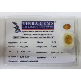 REPORT NO . LY 301CLARITY . N/ACOLOUR . YELLOWSHAPE / CUT . OVALWT . 4.07 CTSDIMENSION . 10-1.8-1.5-1.R . INDEX . 1.76-1.78HARDNESS . 9.0COMMENT . YELLOW SAPPHIRE..