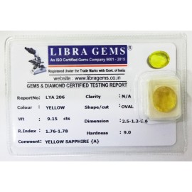 REPORT.NO.-LYA 206CLARITY.-N/ACOLOUR.-YELLOWSHAPE/CUT.-OVALWT.-9.15 CTSDIMENSION.-2-5.1-2.5-6.R.INDEX.-1.76-1.78HARDNESS.-9.0COMMENT.-YELLOW SAPPHIRE { A }..