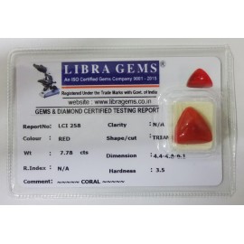 REPORT NO . LCI 258CLARITY . N/ACOLOUR . REDSHAPE / CUT . TRIANGLEWT . 7.78 CTSDIMENSION . 4-4.4-8.6-1.R . INDEX . N/AHARDNESS . 3.5COMMENT . CORAL..