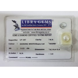REPORT NO . LP 187CLARITY . N/ACOLOUR . SHINING WHITESHAPE / CUT . ROUNDWT . 3.13 CTSDIMENSION . 8-2.8-4.5-4.R . INDEX . N/AHARDNESS . 3.0COMMENT . PEARL..