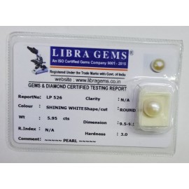 REPORT NO . LP 526CLARITY . N/ACOLOUR . SHINING WHITESHAPE / CUT . ROUNDWT . 5.95 CTSDIMENSION . 9-5.9-5.8-1.R . INDEX . N/AHARDNESS . 3.0COMMENT . PEARL..