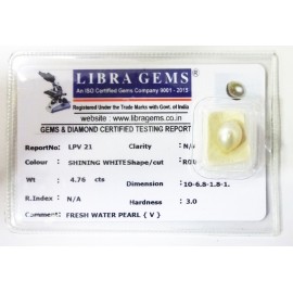 REPORT NO . LPV21CLARITY . N/ACOLOUR . SHINING WHITESHAPE / CUT . ROUNDWT . 4.76 CTSDIMENSION . 10-6.8-1.8-1.R . INDEX . N/AHARDNESS . 3.0COMMENT . FRESH WATER PEARL { V }..