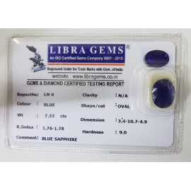 REPORT NO . LN 6CLARITY . N/ACOLOUR . BLUESHAPE / CUT . OVALWT . 7.33 CTSDIMENSION . 3-4.10-7.4-9.R . INDEX . 1.76-1.78HARDNESS . 9.0COMMENT . BLUE SAPPHIRE..