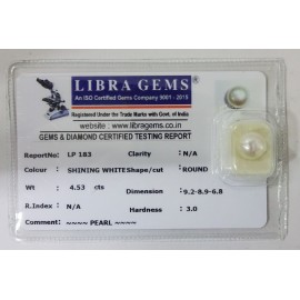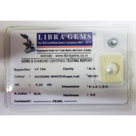 REPORT NO . LP 786CLARITY . N/ACOLOUR . SHINING WHITESHAPE / CUT . ROUNDWT . 4.20 CTSDIMENSION . 9-1.9-1.6-4.R . INDEX . N/AHARDNESS . 3.0COMMENT . PEARL..