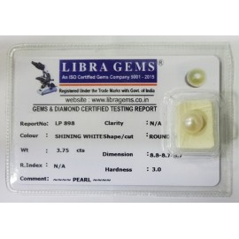 REPORT NO . LP 898CLARITY . N/ACOLOUR . SHINING WHITESHAPE / CUT . ROUNDWT . 3.75 CTSDIMENSION . 8-8.8-7.6-7.R . INDEX . N/AHARDNESS . 3.0COMMENT . PEARL..