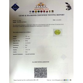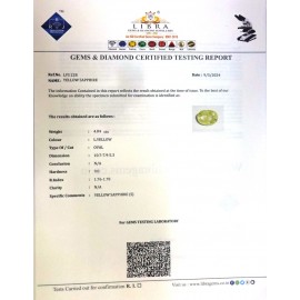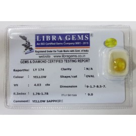 REPORT NO . LY 174CLARITY . N/ACOLOUR . YELLOWSHAPE / CUT . OVALWT . 4.03 CTSDIMENSION . 9-1.7-8.5-7.R . INDEX . 1.76-1.78HARDNESS . 9.0COMMENT . YELLOW SAPPHIRE..