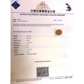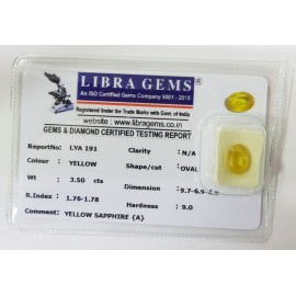 REPORT.NO.LYA 191CLARITY.N/ACOLOUR.YELLOWSHAPE/CUT.OVALWT.3.50 CTSDIMENSION9.7-6.9-4.9.R.INDEX.1.76-1.78HARDNESS.9.0COMMENT.YELLOW SAPPHIRE {A}..