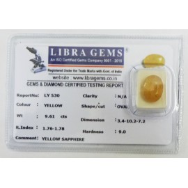 REPORT.NO.LY 530CLARITY.N/ACOLOUR.YELLOWSHAPE/CUT.OVALWT.9.61 CTSDIMENSION.3.4-10.2-7.2R.INDEX.1.76-1.7.8HARDNESS.9.0COMMENT.YELLOW SAPPHIRE..