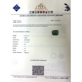 REPORT NO . LEJ 14CLARITY . N/ACOLOUR . GREENSHAPE / CUT . SQUAREWT . 8.85 CTSDIMENSION . 2-1.1-2.7-2.R . INDEX . 1.57HARDNESS . 7.5COMMENT . EMERALD ( J )..
