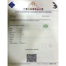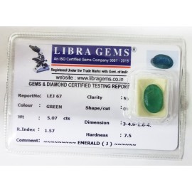 REPORT NO . LEJ 67CLARITY . N/ACOLOUR . GREENSHAPE / CUT . OVALWT . 5.07 CTSDIMENSION . 3-4.9-1.6-4.R . INDEX . 1.57HARDNESS . 7.5COMMENT . EMERALD { J }..