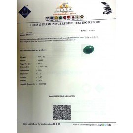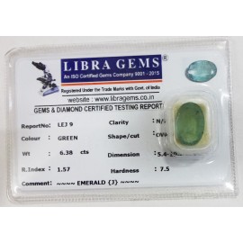 REPORT NO . LEJ 9CLARITY . N/ACOLOUR . GREENSHAPE / CUT . OVALWT . 6.38 CTSDIMENSION . 5-4.10-5.6-2.R . INDEX . 1.57HARDNESS . 7.5COMMENT . EMERALD ( J )..