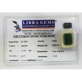 REPORT.NO.LE 353CLARITY.N/ACOLOUR.GREENSHAPE/CUT.RECTANGLEWT.7.17 CTSDIMENSION. 5-9.3-6.9-3.R.INDEX.1.57HARDNESS.7.5COMMENT.EMERALD..