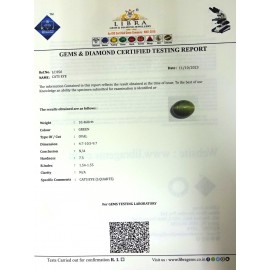 REPORT.NO.-LC 325CLARITY.-N/ACOLOUR.-L . GREENSHAPE/CUT.-ROUNDWT.-7.32 CTSDIMENSION.-2-2.1-7.7-5.R.INDEX.-1.54-1.55HARDNESS.-7.5COMMENT.-CATS EYE { S . QUARTZ }..