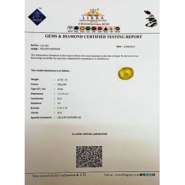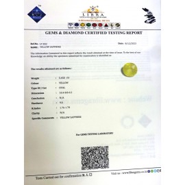 REPORT NO . LY 15CLARITY . N/ACOLOUR . YELLOWSHAPE / CUT . OVALWT . 7.80 CTSDIMENSION . 2-9.10-5.5-5.R . INDEX . 1.76-1.78HARDNESS . 9.0COMMENT . YELLOW SAPPHIRE..