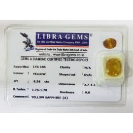 REPORT.NO.LYA 185CLARITY.N/ACOLOUR.YELLOWSHAPE/CUT.OVALWT.8.58 CTSDIMENSION2.7-1.2-7.2.R.INDEX.1.76-1.78HARDNESS.9.0COMMENT.YELLOW SAPPHIRE {A}..