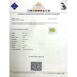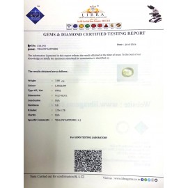 REPORT NO . LY 135CLARITY . N/ACOLOUR . YELLOWSHAPE / CUT . OVALWT . 5.16 CTSDIMENSION . 9-9.1-9.4-6.R . INDEX . 1.76-1.78HARDNESS . 9.0COMMENT . YELLOW SAPPHIRE..