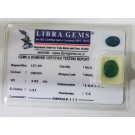 REPORT NO . LEJ 60CLARITY . N/ACOLOUR . GREENSHAPE / CUT . OVALWT . 3.82 CTSDIMENSION . 1-6.9-1.5-2.R . INDEX . 1.57HARDNESS . 7.5COMMENT . EMERALD { J }..