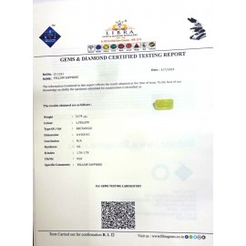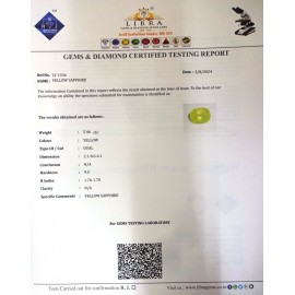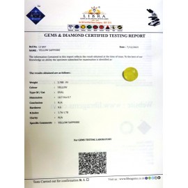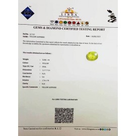 REPORT NO . LY 129CLARITY . N/ACOLOUR . YELLOWSHAPE / CUT . OVALWT . 5.11 CTSDIMENSION . 10-6.8-4.6-4.R . INDEX . 1.76-1.78HARDNESS . 9.0COMMENT . YELLOW SAPPHIRE..