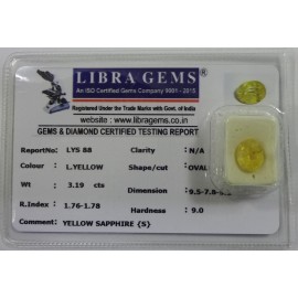 REPORT.NO.-LYS 88CLARITY.-N/ACOLOUR.-L. YELLOWSHAPE/CUT.-OVALWT.-3.19 CTSDIMENSION.-9-5.7-8.5-2.R.INDEX.-1.76-1.78HARDNESS.-9.0COMMENT.-YELLOW SAPPHIRE { S }..