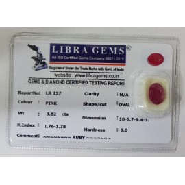 REPORT NO . LR 157CLARITY . N/ACOLOUR . PINKSHAPE / CUT . OVALWT . 3.82 CTSDIMENSION . 10-5.7-9.4-3.R . INDEX . 1.76-1.78HARDNESS . 9.0COMMENT . RUBY..