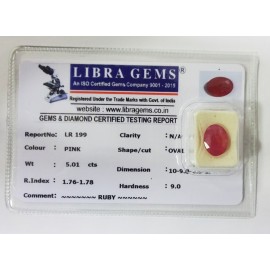 REPORT NO . LR 199CLARITY . N/ACOLOUR . PINKSHAPE / CUT . OVALWT . 5.01 CTSDIMENSION . 10-9.8-6.5-1.R . INDEX . 1.76-1.78HARDNESS . 9.0COMMENT . RUBY..
