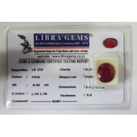 REPORT NO . LR 258CLARITY . N/ACOLOUR . PINKSHAPE / CUT . OVALWT . 8.00 CTSDIMENSION . 3-2.1-1.5-8.R . INDEX . 1.76-1.78HARDNESS . 9.0COMMENT . RUBY..