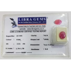 REPORT.NO.-LR 445CLARITY.-N/ACOLOUR.-PINKSHAPE/CUT.-OVALWT.-3.51 CTSDIMENSION.-9-2.7-6.5-2.R.INDEX.-1.76-1.78HARDNESS.-9.0COMMENT.-RUBY..