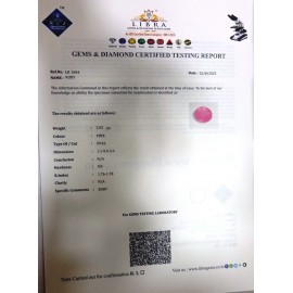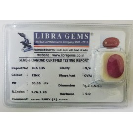 REPORT.NO.-LRA 135CLARITY.-N/ACOLOUR.-PINKSHAPE/CUT.-OVALWT.-10.56 CTSDIMENSION.-6-4.1-5.5-1.R.INDEX.-1.76-1.78HARDNESS.-9.0COMMENT.-RUBY { A }..