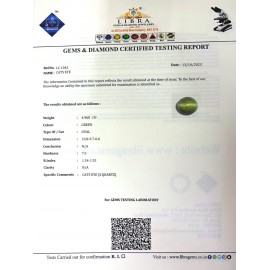 REPORT.NO.-LC 389CLARITY.-N/ACOLOUR.-GREENSHAPE/CUT.-OVALWT.-7.20 CTSDIMENSION.-2-1.10-1.8-1.R.INDEX.-1.54-1.55HARDNESS.-7.5COMMENT.-CATS EYE { S . QUARTZ }..