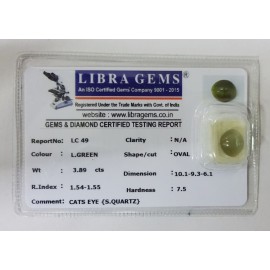 REPORT NO . LC 49CLARITY . N/ACOLOUR . L . GREENSHAPE / CUT . ROUNDWT . 3.89 CTSDIMENSION . 10-1.9-3.6-1.R . INDEX . 1.54-1.55HARDNESS . 7.5COMMENT . CATS EYE { S . SQUARTZ }..