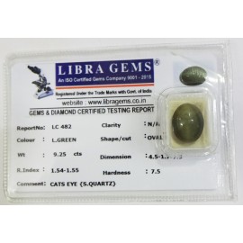 REPORT.NO.-LC 482CLARITY.-N/ACOLOUR.-L . GREENSHAPE/CUT.-OVALWT.-9.25 CTSDIMENSION.-4-5.1-7.7-3.R.INDEX.-1.54-1.55HARDNESS.-7.5COMMENT.-CATS EYE { S . QUARTZ }..