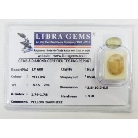 REPORT.NO.LY 609CLARITY.N/ACOLOUR.YELLOWSHAPE/CUT.OVAL WT.8.15 CTSDIMENSION.3.5-10.2-5.5R.INDEX.1.76-1.7.8HARDNESS.9.0COMMENT.YELLOW SAPPHIRE..