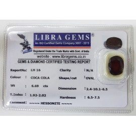 REPORT NO . LH 16CLARITY . N/ACOLOUR . COCA COLASHAPE / CUT . OVALWT . 6.69 CTSDIMENSION . 2-4.10-1.6-5.R . INDEX . 1.92-2.02HARDNESS . 6.5-7.5COMMENT . HESSONITE..