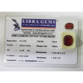 REPORT.NO.-LH 255CLARITY.-N/ACOLOUR.-COCA COLASHAPE/CUT.-OVALWT.-5.29 CTSDIMENSION.-1.9-10.1-5.1R.INDEX.-1.92-2.02HARDNESS.-6.5-7.5COMMENT.-HESSONITE..