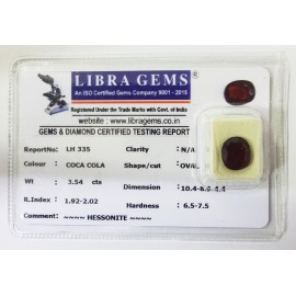 REPORT.NO.-LH 335CLARITY.-N/ACOLOUR.-COCA COLASHAPE/CUT.-OVALWT.-3.54 CTSDIMENSION.-10-4.8-9.4-4.R.INDEX.-1.92-2.02HARDNESS.-6.5-7.5COMMENT.-HESSONITE..