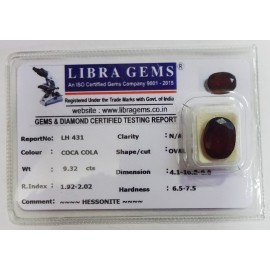 REPORT.NO.-LH 431CLARITY.-N/ACOLOUR.-COCA COLASHAPE/CUT.-OVALWT.-9.32 CTSDIMENSION.-4-1.10-8.6-6.R.INDEX.-1.92-2.02HARDNESS.-6.5-7.5COMMENT.-HESSONITE..