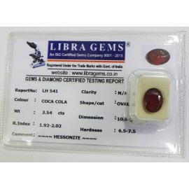 REPORT.NO.LH 541CLARITY.N/A COLOUR.COCA COLA SHAPE/CUT.OVAL WT.3.54 CTS DIMENSION. 10.9-8.5-4.2R.INDEX.1.92-2.02HARDNESS.6.5-7.5COMMENT. HESSONITE..