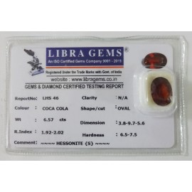 REPORT NO . LHS 46CLARITY . N/ACOLOUR . COCA COLASHAPE / CUT . OVALWT . 6.57 CTSDIMENSION . 3-8.9-7.5-6.R . INDEX . 1.92-2.02HARDNESS . 6.5-7.5COMMENT . HESSONITE { S }..