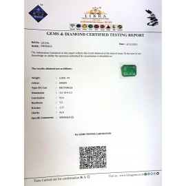 DATE:4-12-2023REF.NO:LEJ 296NAME:EMERALDWEIGHT:6.05 CTSCOLOUR:GREENTYPE OF/CUT:RECTANGLEDIMENSION:3-6.10-4.5-3.CONCLUSION:N/AHARDNESS:7.5R.INDEX:1.57CLARITY:N/ASPECIFIC COMMENTS:EMERALD { J ..