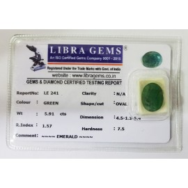 REPORT.NO.-LE 241CLARITY.-N/ACOLOUR.-GREENSHAPE/CUT.-OVALWT.-5.91 CTSDIMENSION.-4-5.1-2.5-4.R.INDEX.-1.57HARDNESS.-7.5COMMENT.-EMERALD..