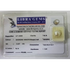 REPORT.NO-LP 1000CLARITY-N/ACOLOUR-SHINING WHITESHAPE/CUT-ROUNDWT-3.67 CTSDIMENSION-8.6-8.5-6.3R.INDEX-N/AHARDNESS-3.0COMMENT-PEARL..