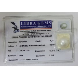 REPORT NO . LP 1049CLARITY . N/ACOLOUR . SHINING WHITESHAPE / CUT . ROUNDWT . 12.24 CTSDIMENSION . 2-7.9-1.2-7.R . INDEX . N/AHARDNESS . 3.0COMMENT . PEARL..