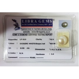 REPORT NO . LP 810CLARITY . N/ACOLOUR . SHINING WHITESHAPE / CUT . ROUNDWT . 8.98 CTSDIMENSION . 1-6.1-6.8-8.R . INDEX . N/AHARDNESS . 3.0COMMENT . PEARL..
