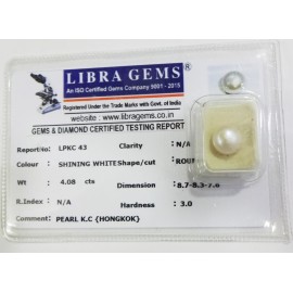 REPORT.NO.-LPKC 43CLARITY.-N/ACOLOUR.-SHINING WHITESHAPE/CUT.-ROUNDWT.-4.08 CTSDIMENSION.-8-7.8-3.7-6.R.INDEX.-N/AHARDNESS.-3.0COMMENT.-PEARL K.C { HONGKOK }..