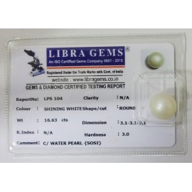 REPORT NO . LPS 104CLARITY . N/ACOLOUR . SHINING WHITESHAPE / CUT . ROUNDWT . 16.63 CTSDIMENSION . 3-1.3-1.3-1.R . INDEX . N/AHARDNESS . 3.0COMMENT . C / WATER PEARL { SOSI }..
