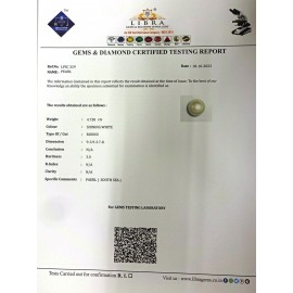 REPORT NO . LP 453CLARITY . N/ACOLOUR . SHINING WHITESHAPE / CUT . ROUNDWT . 4.00 CTSDIMENSION . 8-7.6-8.8-7.R . INDEX . N/AHARDNESS . 3.0COMMENT . PEARL..