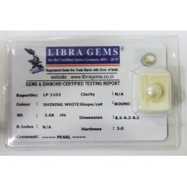 REPORT NO . LP 1103CLARITY . N/ACOLOUR . SHINING WHITESHAPE / CUT . ROUNDWT . 3.68 CTSDIMENSION . 8-5.6-2.8-5.R . INDEX . N/AHARDNESS . 3.0COMMENT . PEARL..
