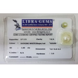 REPORT NO . LP 121CLARITY . N/ACOLOUR . SHINING WHITESHAPE / CUT . ROUNDWT . 3.89 CTSDIMENSION . 8-7.8-8.6-6.R . INDEX . N/AHARDNESS . 3.0COMMENT . PEARL..